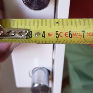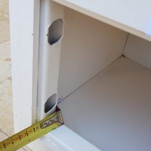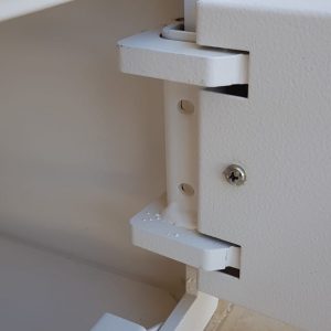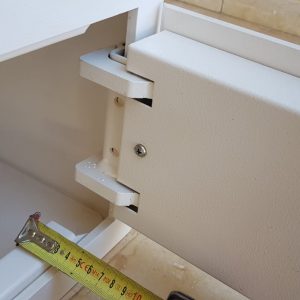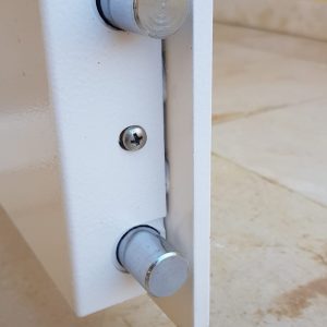 Dos cuñas de acero situadas en la parte superior de la puerta, detrás de las bisagras, completan el sistema de cierre de la caja. En caso de cortar las bisagras, la puerta no puede abrirse debido a la acción de las cuñas.